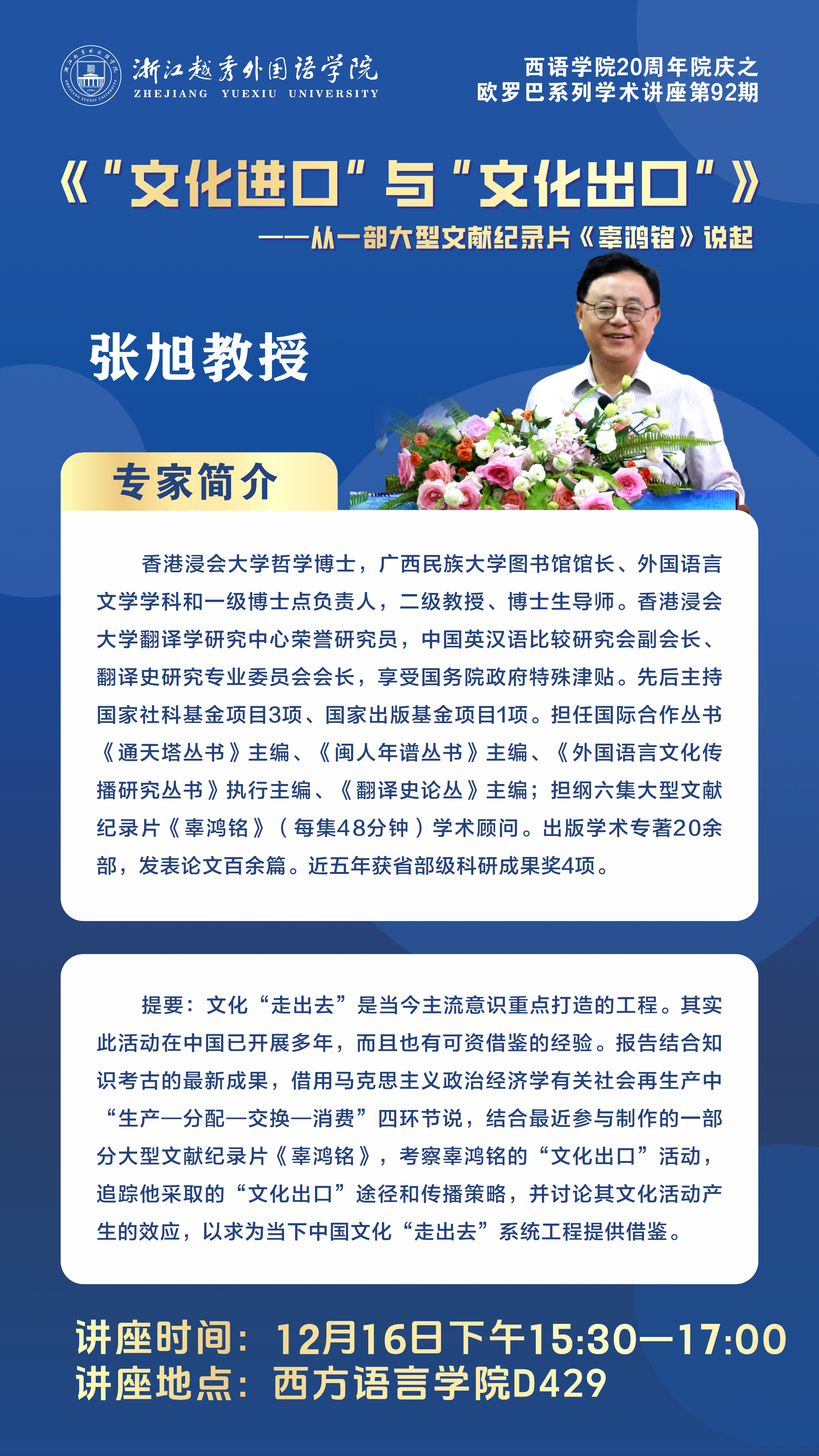 主讲人:张旭 活动地点:稽山校区西方语言学院D429 主办单位: 西方语言学院